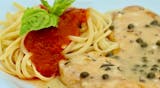 Chicken cutlet pounded thin, in a light lemon caper butter sauce. Served with a side of spaghetti marinara and a side of garlic bread.
