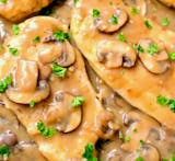 Chicken Cutlet Pounded thin sautéed in a rich mushroom sauce with Marsala wine. Served with a side of Spaghetti marinara and garlic bread.