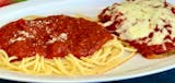 Chicken Cutlet pounded thin sautéed and topped with marinara sauce and fresh mozzarella. Served with a side of spaghetti in marinara sauce with garlic bread.