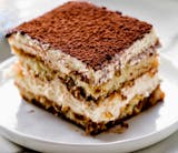 Layers of Espresso Soaked ladyfingers with sweet cream mascarpone filling dusted with Dutch cocoa powder.